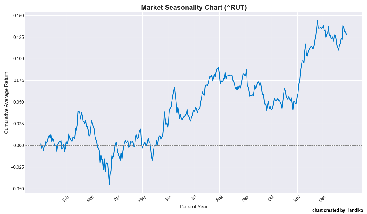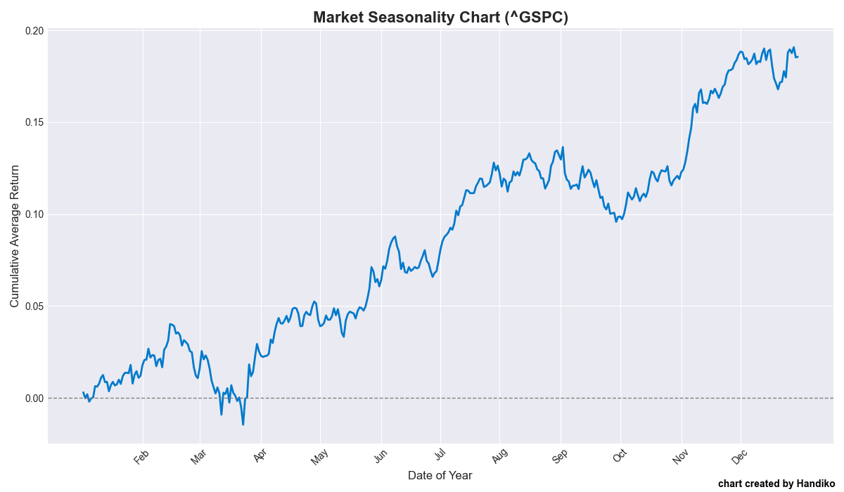 This is a cumulative average return chart. It’s calculated by first finding the average daily return for each specific day of the year over the last decade. These daily averages are then accumulated to create the plotted line. That’s it! That’s simple!