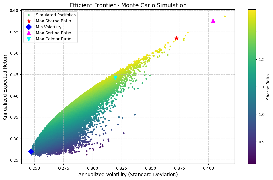 The results are beautifully visualized using matplotlib. The plot maps the entire simulated universe in the Return vs. Volatility space. Portfolios are color-coded by their Sharpe Ratio for instant insight into efficiency, and the four optimal portfolios are highlighted with distinct markers to pinpoint the best allocations according to each specific risk metric.