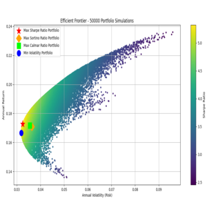 This project provides a robust Python solution for determining optimal portfolio allocations based on a set of user-defined stock tickers and historical data. Utilizing the Monte Carlo Simulation technique, this tool identifies portfolios that excel across several key risk-adjusted metrics, moving beyond just the traditional Sharpe Ratio to offer a more nuanced view of capital efficiency and risk management.