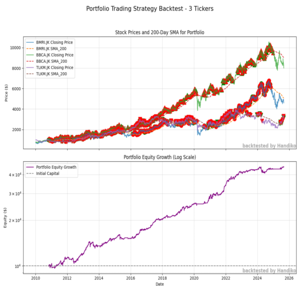 Python script to implement and backtests a multi-asset trading strategy on a portfolio of many different stock tickers. It leverages common technical indicators to generate buy and sell signals and simulates portfolio performance over historical data.